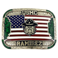 The Veteran trophy belt buckle is based around our signature "Crushed Stone" stone design. The crushed turquoise custom western buckle looks great on your belt. The stone colors can be changed out to other colors if you would like, just tell us in our buckle customization form. The custom lettering can be changed to whatever you need as well. The design of this buckle is an eye catcher and is a great way to show off someone’s hard work, achievement, or personalization. This buckle measures 3.5" inches tall by 4.5" inches wide. The back of the buckle has a hook for your belt hole. It also has a swivel bar to attach to your belt.