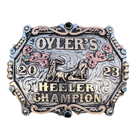 Belt buckles are a great way to advertise or show an achievement, or to personalize one for yourself. This buckle is only an example of how this buckle looks. Your buckle will be made to your specifications, lettering, stone color, etc. For example, if you see a team roper as a figurine and you would like a barrel racer, this will be changed to fit your needs. That goes for the lettering also; whatever lettering you see on the buckle is just an example and will be changed to the lettering you want.