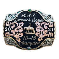 Belt buckles are a great way to advertise or show an achievement, or to personalize one for yourself. This buckle is only an example of how this buckle looks. Your buckle will be made to your specifications, lettering, stone color, etc. For example, if you see a team roper as a figurine and you would like a barrel racer, this will be changed to fit your needs. That goes for the lettering also; whatever lettering you see on the buckle is just an example and will be changed to the lettering you want.