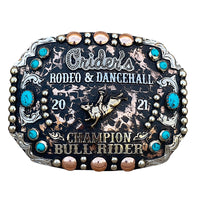 The Willis Belt Buckle is a round antique silver plated buckle that looks awesome with its turquoise stones. This custom trophy buckle has a very unique look, and the custom lettering can be changed to whatever you need. The shimmer of this buckle will catch your eye and is a great way to show off someone’s hard work, achievement, or personalization. This buckle measures 3.5" inches tall by 4.5" inches wide. The back of the buckle has a hook for your belt hole. It also has a swivel bar to attach to your belt.