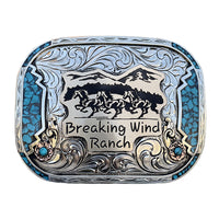 The Wind Buckle is a unique shaped silver plated buckle that looks awesome with its design . This custom buckle has a very unique look, and the custom lettering can be changed to whatever you need. The shimmer of this buckle will catch your eye and is a great way to show off someone’s hard work, achievement, or personalization. This buckle measures 3.5" inches tall by 4.5" inches wide. The back of the buckle has a hook for your belt hole. It also has a swivel bar to attach to your belt.