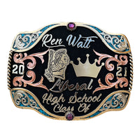 The Wyoming Graduation Buckle is a unique shaped silver plated buckle that looks awesome with its accents, figurines, and accomplishments in the corners. This custom buckle has a very unique look, and the custom lettering, and figurines can be changed to whatever you need. The shimmer of this buckle will catch your eye and is a great way to show off someone’s hard work, achievement, or personalization. This buckle measures 3.5" inches tall by 4.5" inches wide normally but we have different sizes available. The back of the buckle has a hook for your belt hole. It also has a swivel bar to attach to your belt.