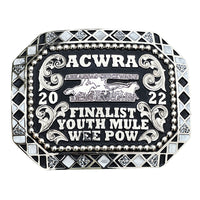 The York Buckle is a unique shaped silver plated buckle that looks awesome with its beautiful border. This custom trophy buckle has a very unique look, and the custom lettering can be changed to whatever you need. The shimmer of this buckle will catch your eye and is a great way to show off someone’s hard work, achievement, or personalization. This buckle measures 3.5" inches tall by 4.5" inches wide. The back of the buckle has a hook for your belt hole. It also has a swivel bar to attach to your belt.
