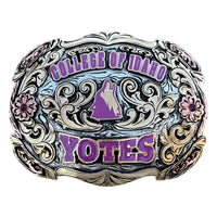 The Yotes Class Buckle is a unique shaped silver plated buckle that looks awesome with its accents, figurines, and accomplishments in the corners. This custom buckle has a very unique look, and the custom lettering, and figurines can be changed to whatever you need. The shimmer of this buckle will catch your eye and is a great way to show off someone’s hard work, achievement, or personalization. This buckle measures 3.5" inches tall by 4.5" inches wide normally but we have different sizes available. The back of the buckle has a hook for your belt hole. It also has a swivel bar to attach to your belt.