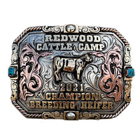 The Yuma Buckle is an antique silver plated buckle with a cool border around the buckle. This custom trophy buckle has a very unique look, and the custom lettering can be changed to whatever you need. The shimmer of this buckle will catch your eye and is a great way to show off someone’s hard work, achievement, or personalization. This buckle measures 3.5" inches tall by 4.5" inches wide. The back of the buckle has a hook for your belt hole. It also has a swivel bar to attach to your belt.
