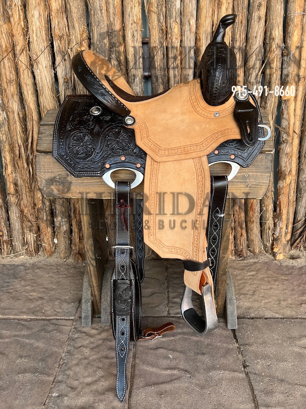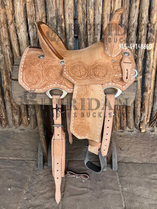 Sheridan Barrel Racing Saddle Tooling on Roughout White Buckstitch