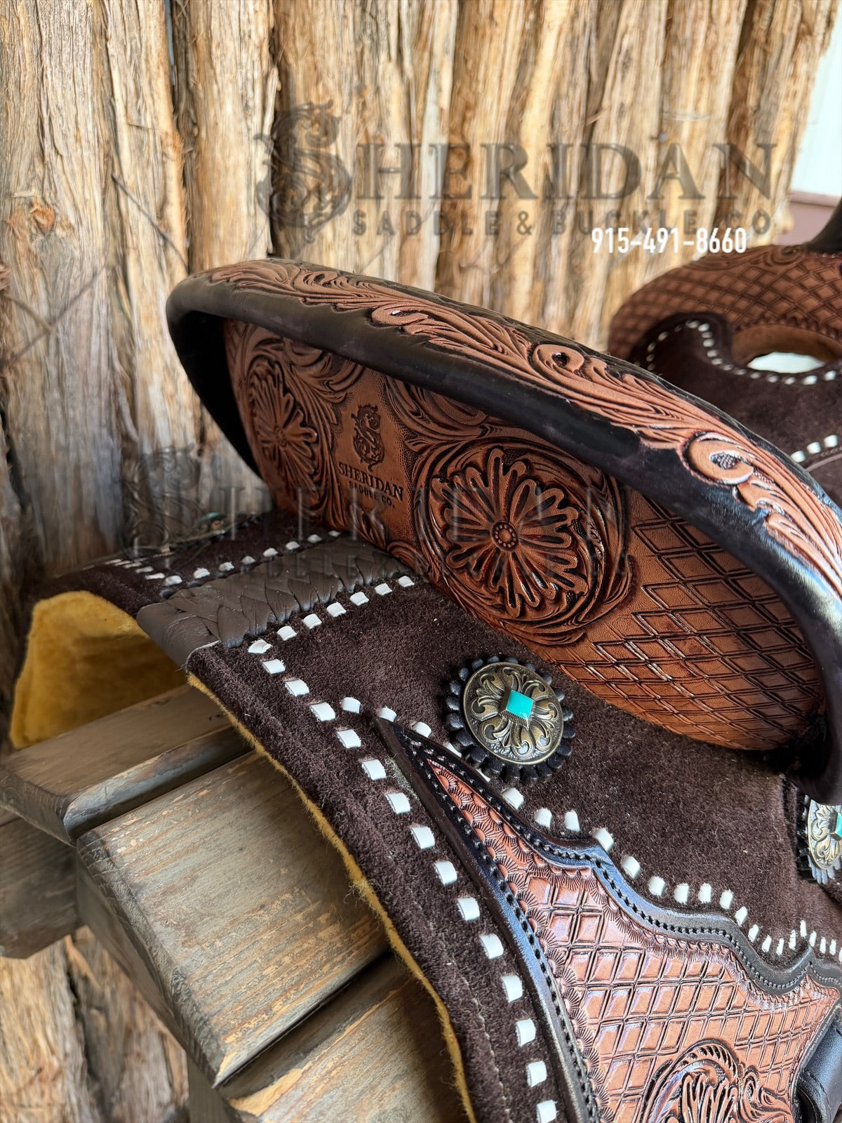 • Leather Color: Chocolate Suede Synthetic to Cut Weight and Antique Tooling