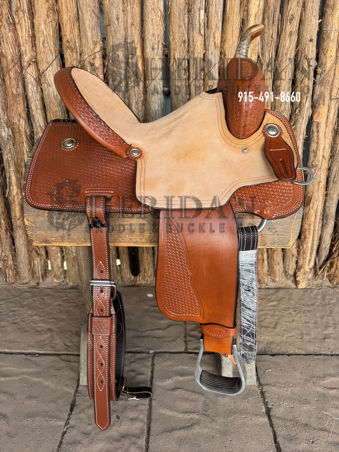 Sheridan Saddle Co. offers a great line of tough kids saddles for sale. This 13 inch youth ranch saddle for sale is a tough saddle that will last for generations. We offer the toughest kids saddle on the market. Our first priority on these kids saddles is to make sure they are a deep seat kids saddle. This saddle is ready to go to work and teach your children how to ride. The seat on this saddle is made to be comfortable and spend hours in the saddle. Sheridan Saddle Co is great for anyone needing a tough kids saddle for their children or just a good strong saddle for kids to learn how to keep their balance in the saddle.