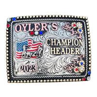 The Dryden Buckle is a unique shaped Silver plated buckle that looks awesome with its beautiful Bead and rope border. This custom trophy buckle has a very unique look, and the custom lettering can be changed to whatever you need. The shimmer of this buckle will catch your eye and is a great way to show off someone’s hard work, achievement, or personalization. This buckle measures 3.5" inches tall by 4.5" inches wide. The back of the buckle has a hook for your belt hole. It also has a swivel bar to attach to your belt.
