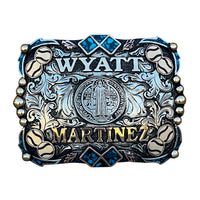 The Homerun Buckle is a unique shaped silver plated buckle that looks awesome with its logos in the center. This custom buckle has a very unique look, and the custom lettering can be changed to whatever you need. The shimmer of this buckle will catch your eye and is a great way to show off someone’s hard work, achievement, or personalization. This buckle measures 3.5" inches tall by 4.5" inches wide. The back of the buckle has a hook for your belt hole. It also has a swivel bar to attach to your belt.