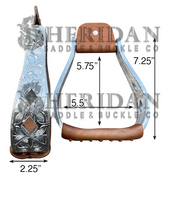 Sheridan provides high quality Visalia stirrups that have a good feel when you are riding. This is one of Sheridan Saddle's upgraded stirrups we put on a lot of saddles. Sheridan Visalia Stirrups are aluminum construction to be lightweight and cut some weight off your saddle. These light stirrups also have a traditional leather top swivel and leather bottom. The Visalia Stirrup was started in California, to provide a larger stirrup for riders in that time, and became a very popular shape and design from then on. This stirrup gives the rider a 1.75 inch tread with a slim design, they fit your foot well and not too big or clunky. The lightweight design of this stirrup helps you feel close contact with your horse. Visalia Stirrups have a large following and have been used for a century as a very popular stirrup. This stirrup is upgraded with diamonds cut out on the side and hand engraving.